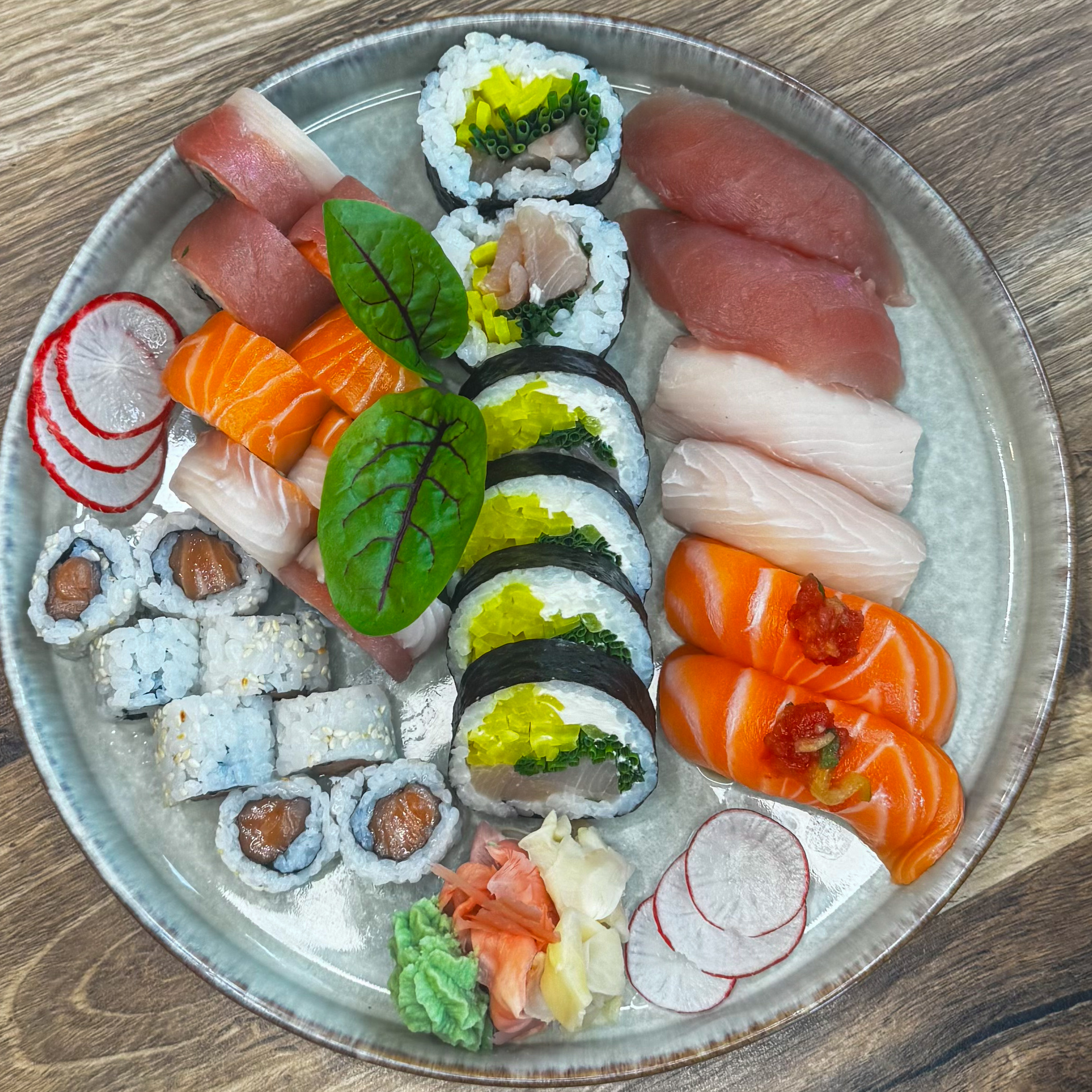 8 szt. California z surowym łososiem, obłożona koryfeną, tuńczykiem i łososiem